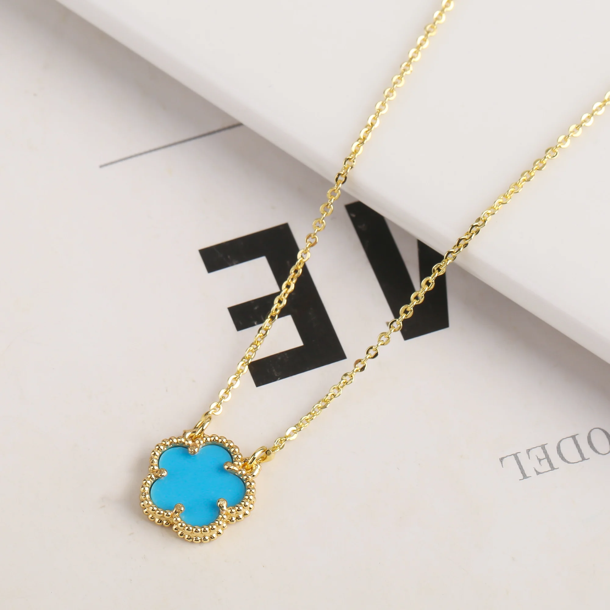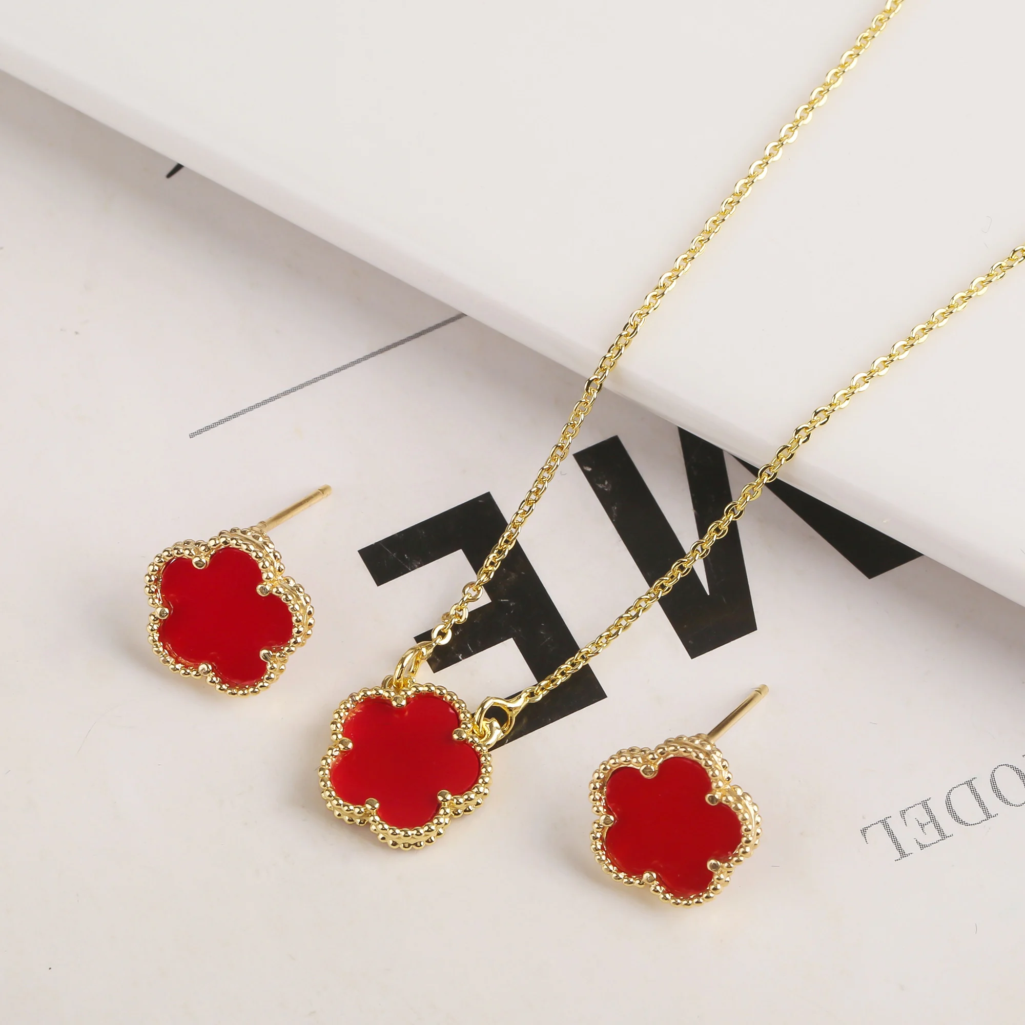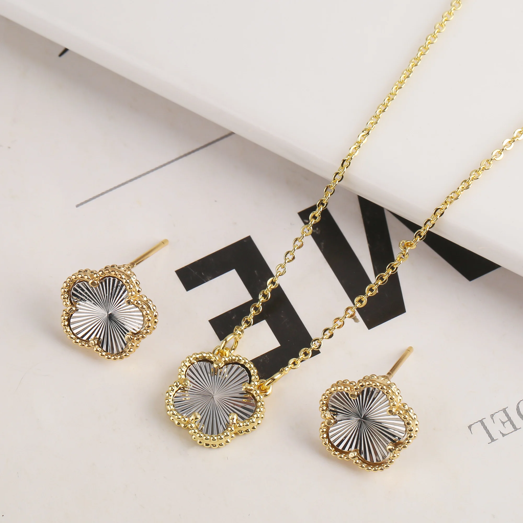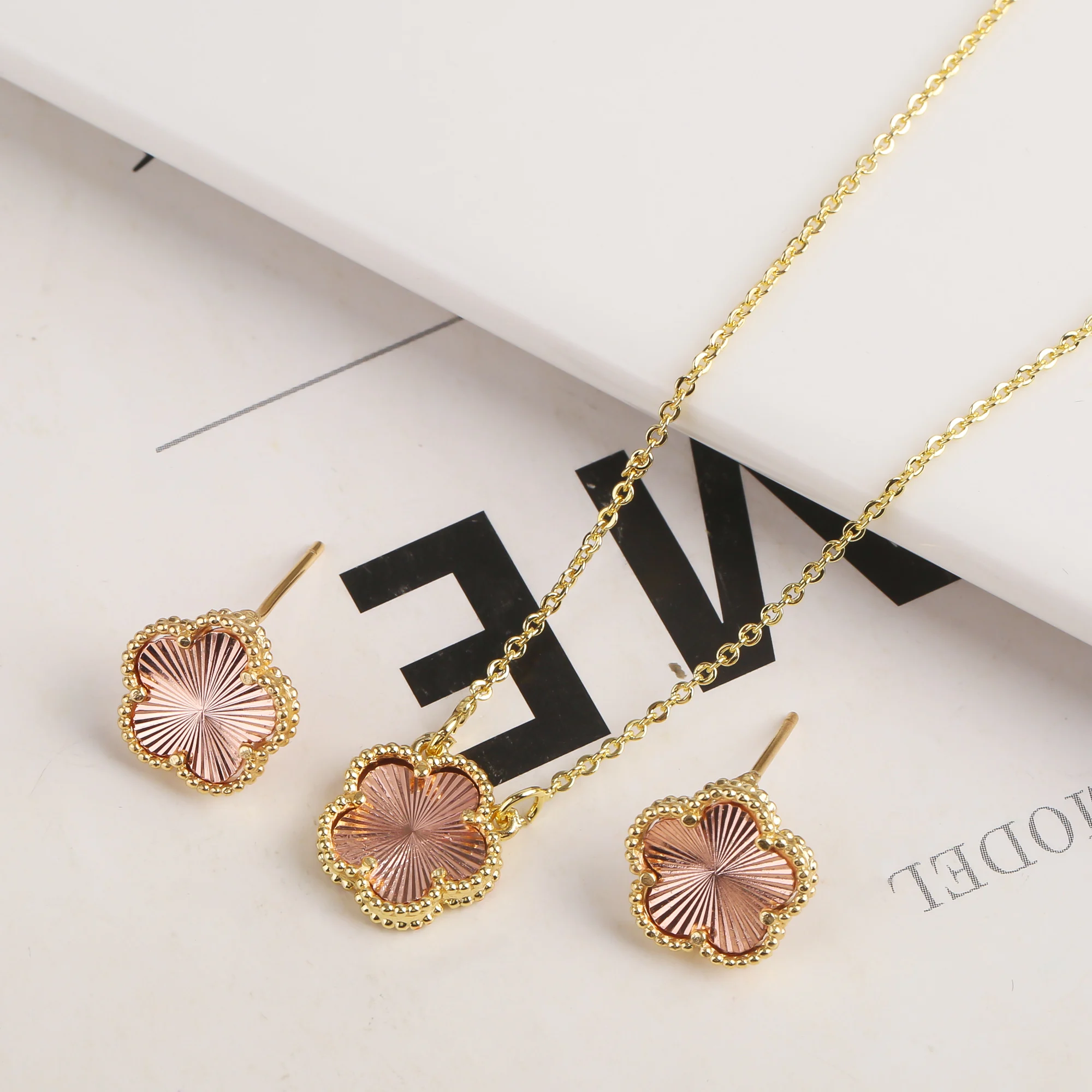 18K Gold Plated High Quality Simple Plant Five Leaf Flower Natural Stone Metal Pendant Necklace Earring Set Women's Clover
