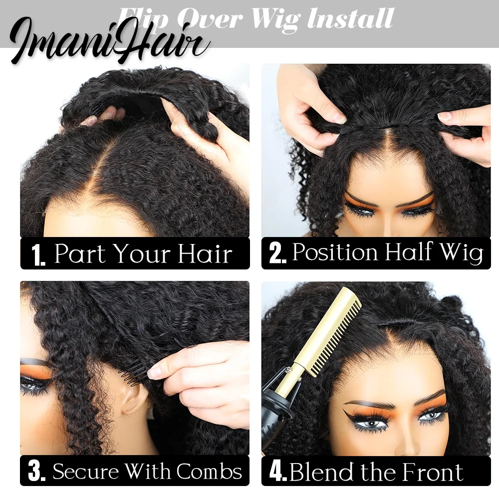 210% Half Wigs Human Hair Kinky Curly Headband Wig Upgrade 3 IN 1 Half Wig With Drawstring Seamless Clip Ins Flip Over Wig