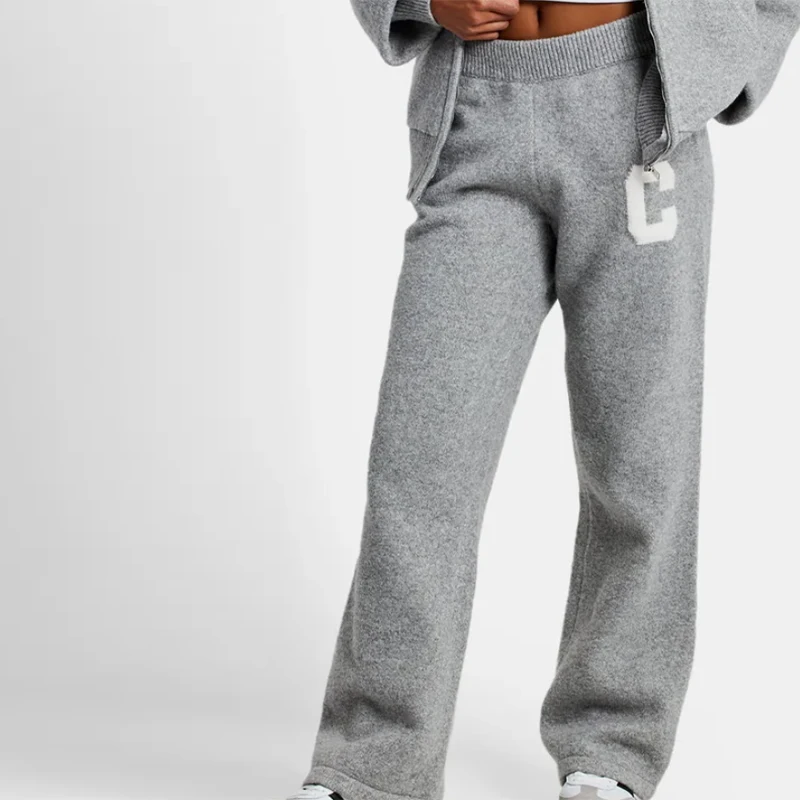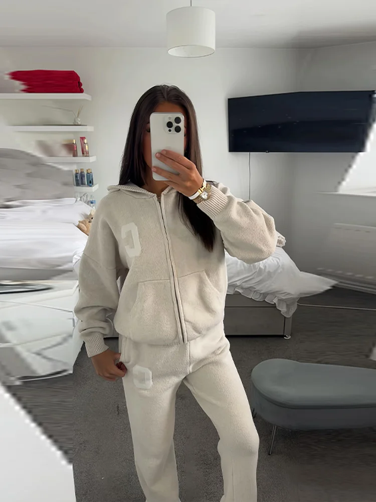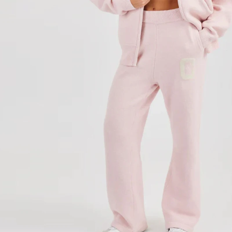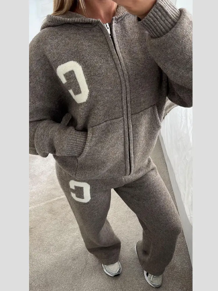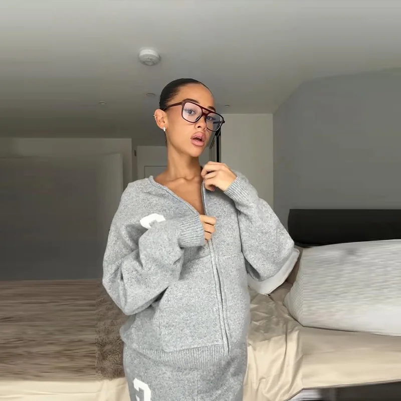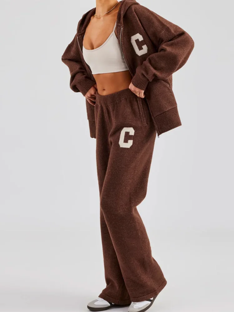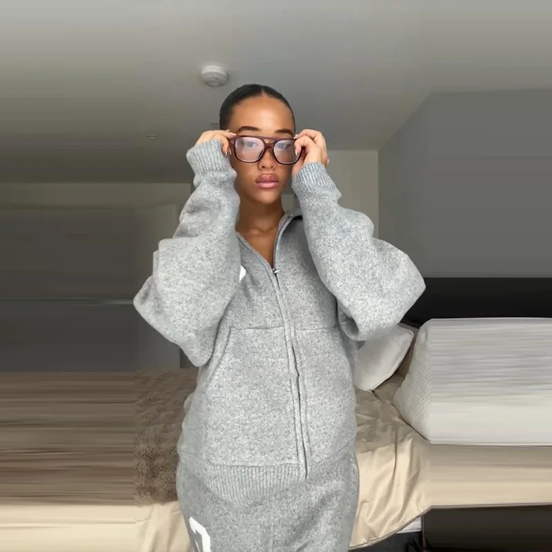 Knitted Women's Pant Sets Hooded Long Sleeve Dropped Shoulder Zipper Female Jacket Solid Elastic Waist Straight Pants For Ladies