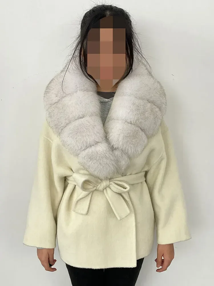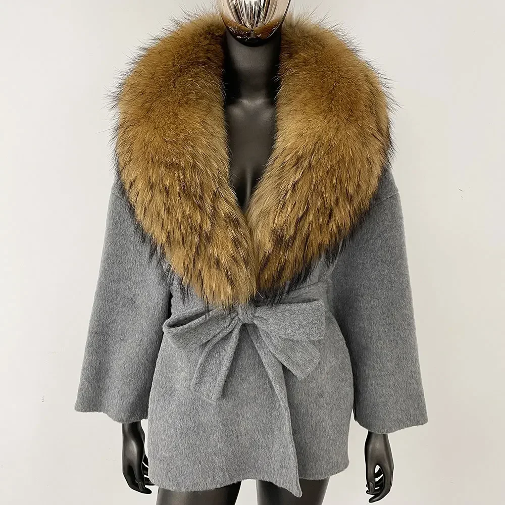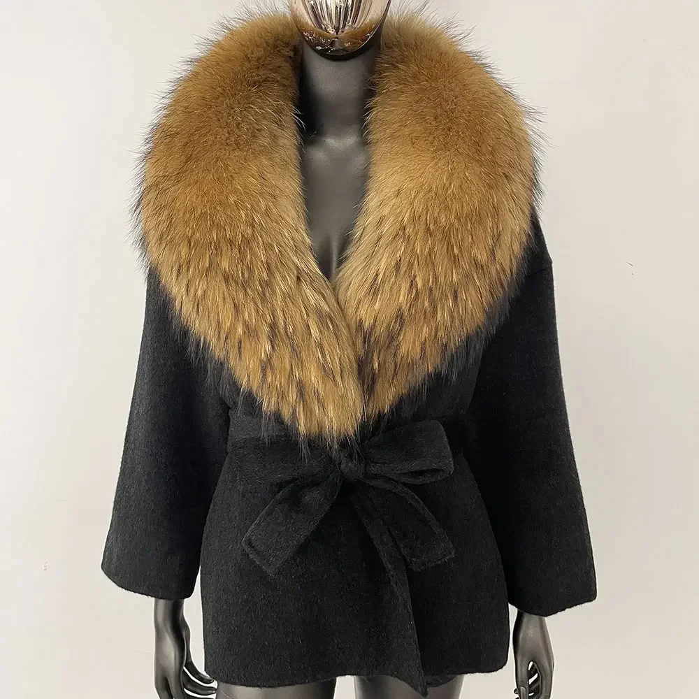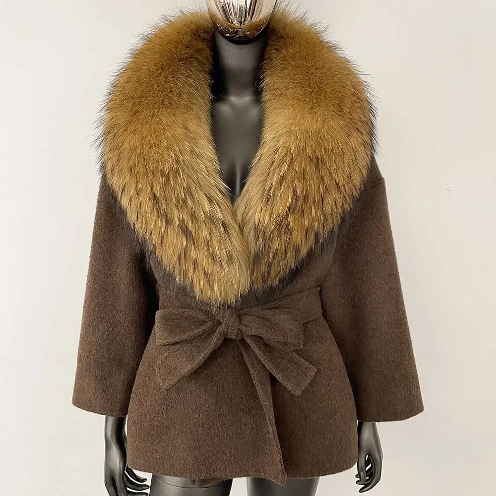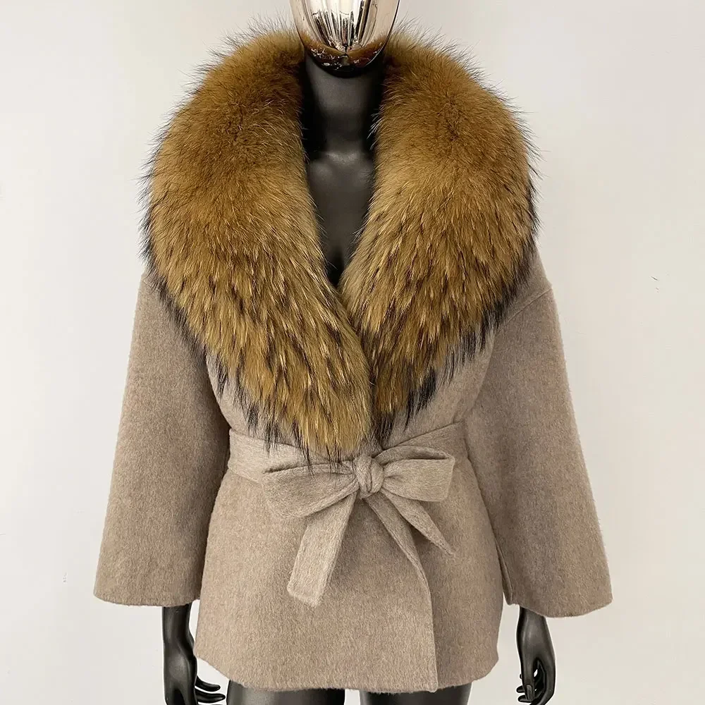 OFTBUY Real Raccoon Fox Fur Coat 2024 New Belt Pocket Winter Blends Wool Coat Women Loose Outerwear Fur Jacket Casual Streetwear