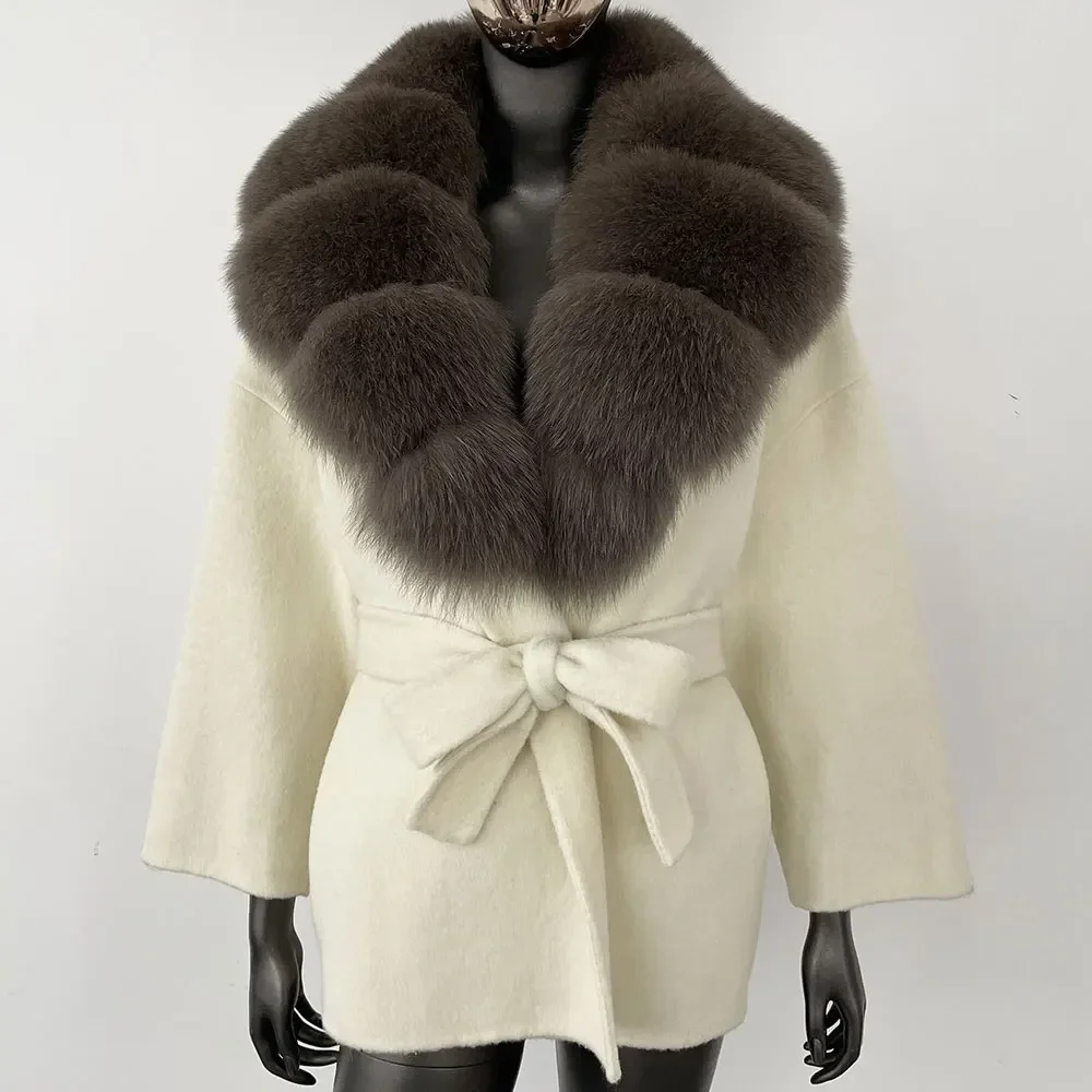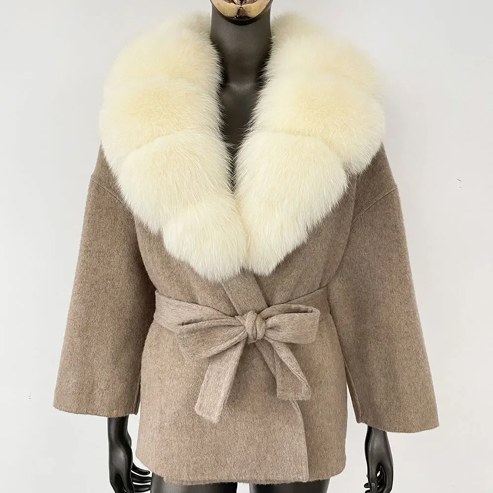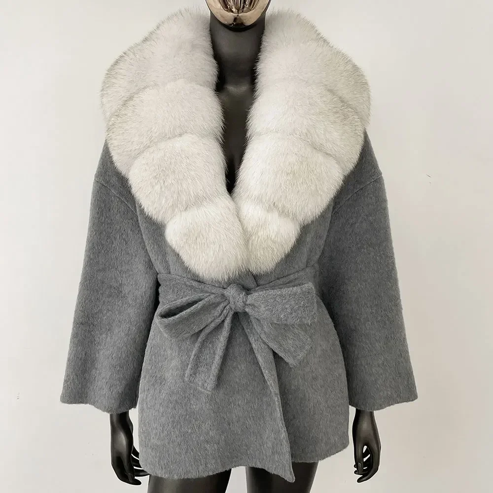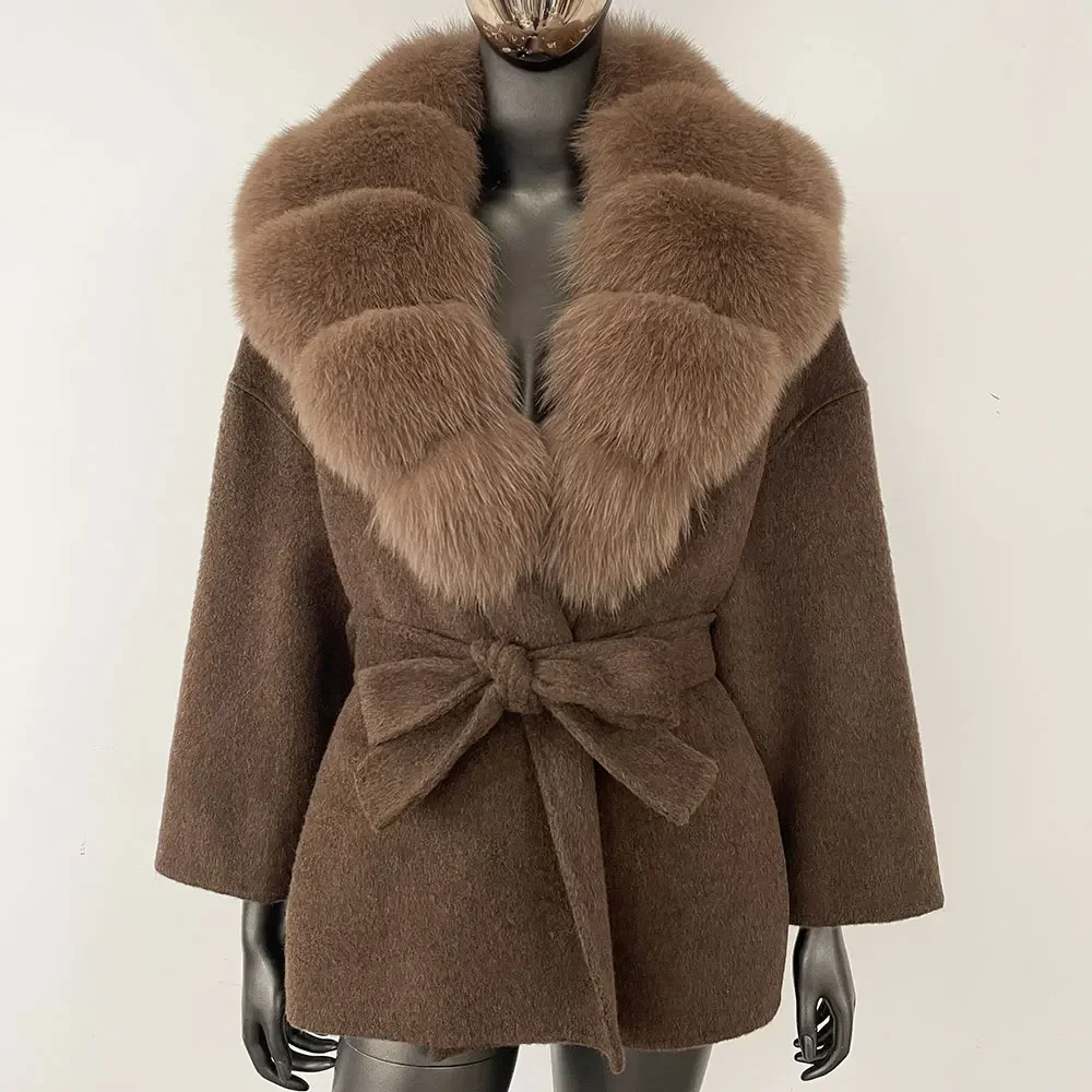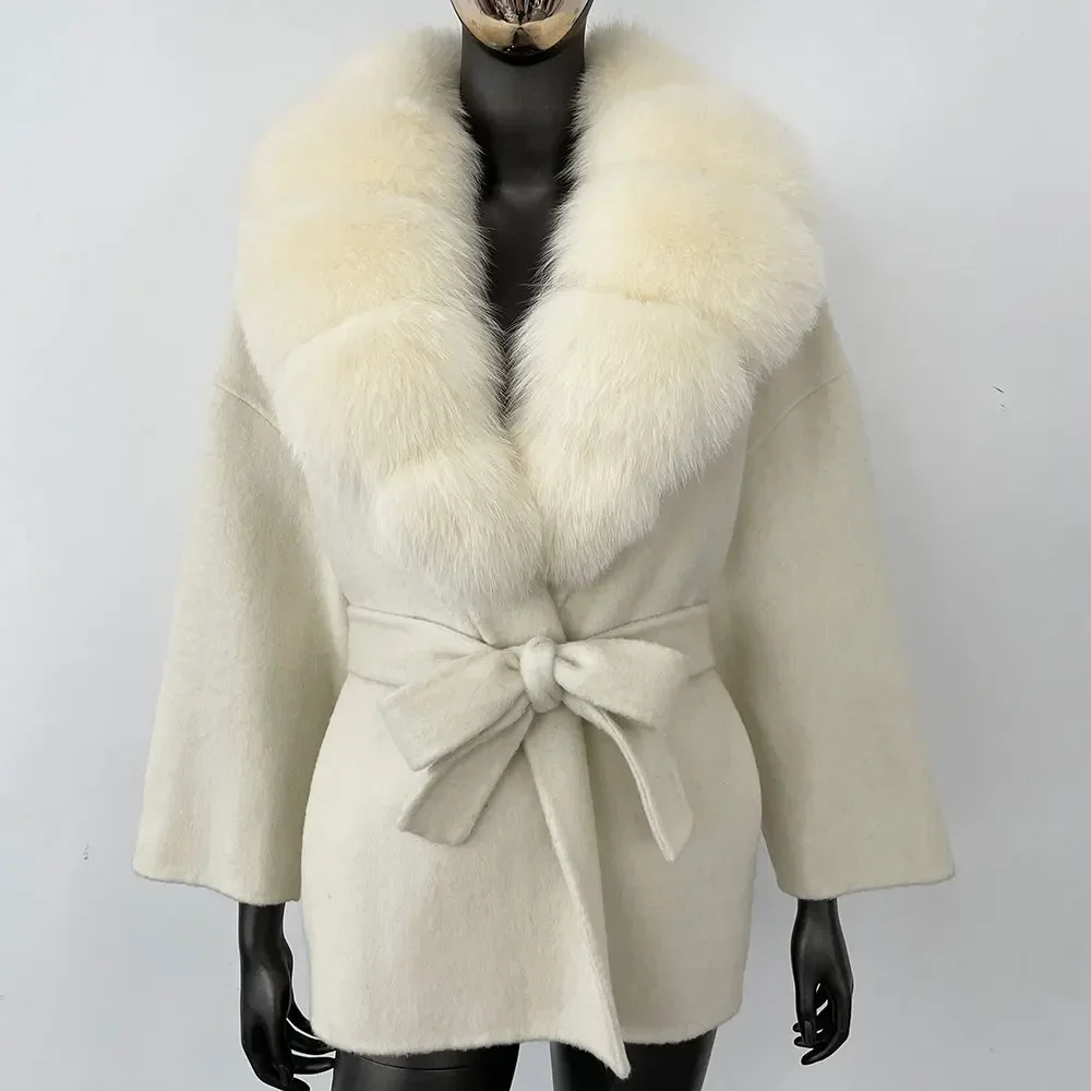 OFTBUY Real Raccoon Fox Fur Coat 2024 New Belt Pocket Winter Blends Wool Coat Women Loose Outerwear Fur Jacket Casual Streetwear