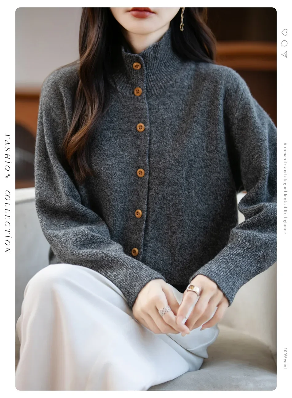 Pure Wool Thickened Knitted High Collar Sweater Coat for Women Winter Season Button up Cardigan Outerwear Floral Pattern