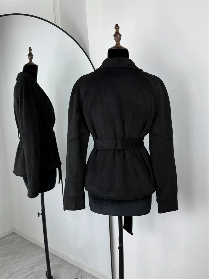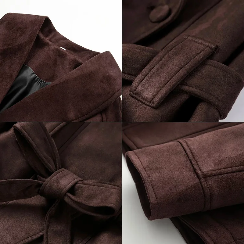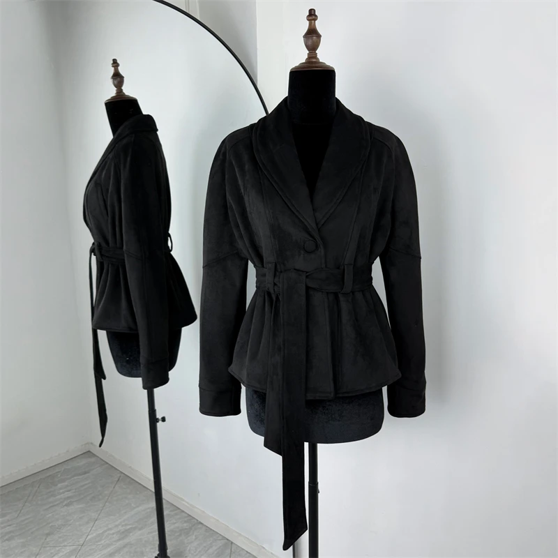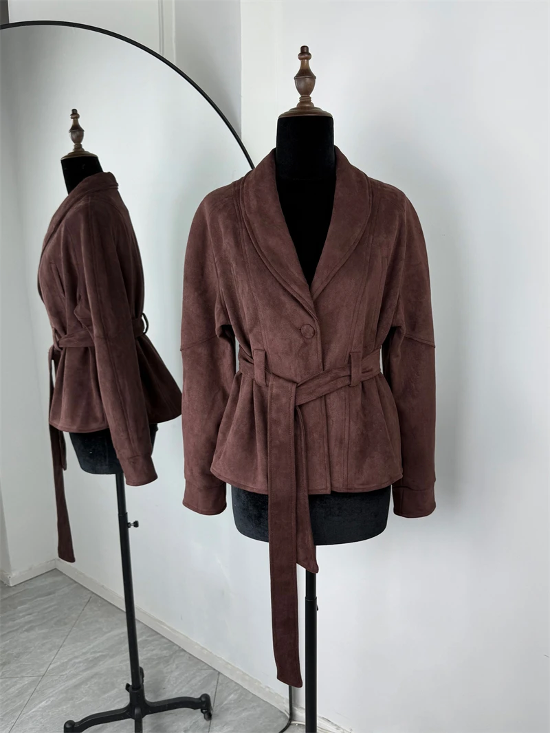 Tornova Retro Suede Long-sleeved Jacket Coat Female V neck Lace Up Jacket 2025 Autumn Winter New Commute Office Lady Outerwear