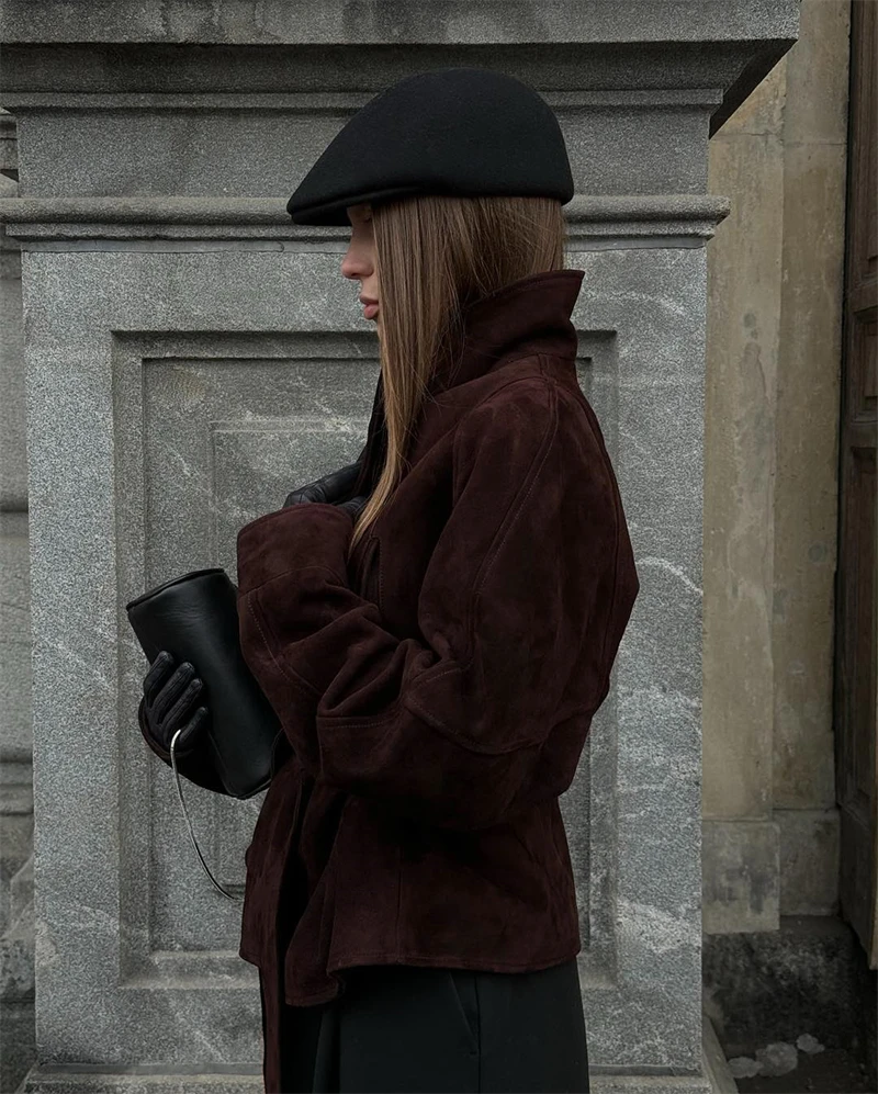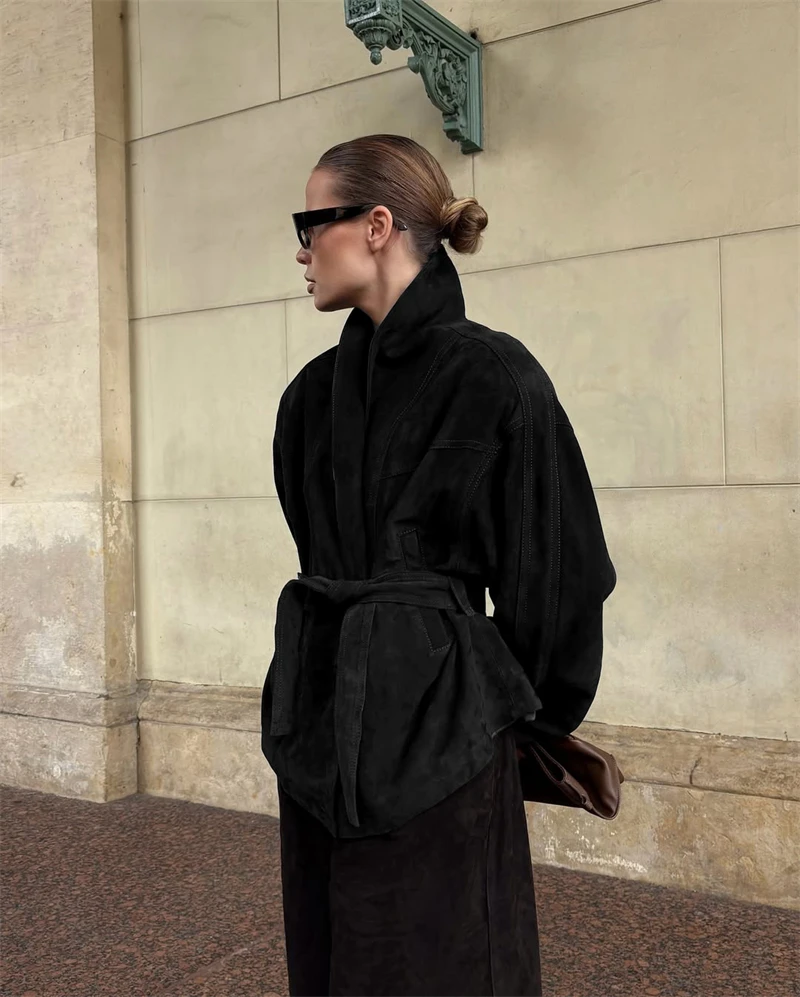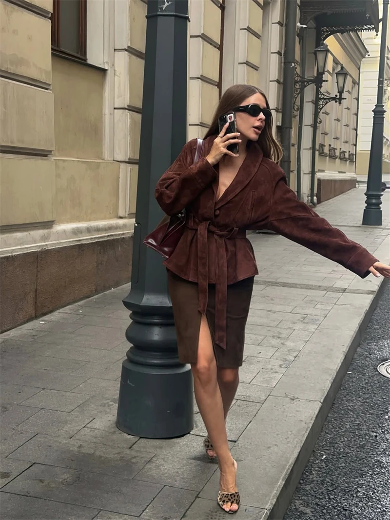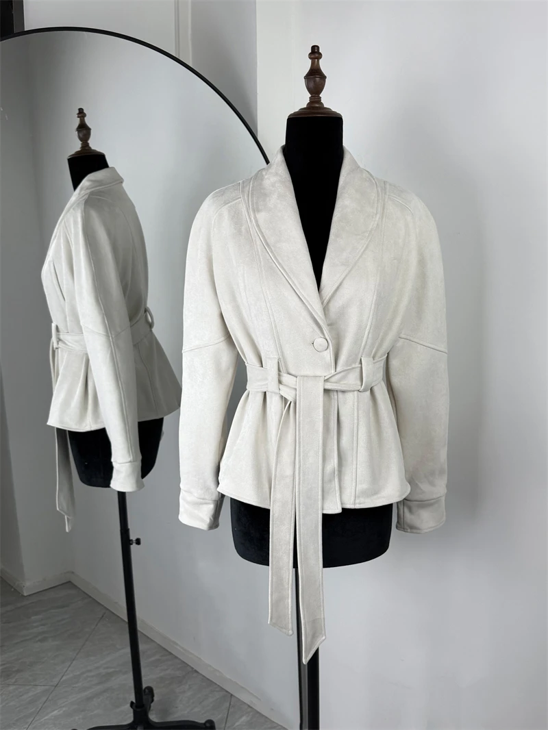 Tornova Retro Suede Long-sleeved Jacket Coat Female V neck Lace Up Jacket 2025 Autumn Winter New Commute Office Lady Outerwear