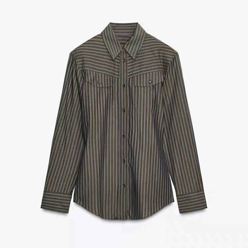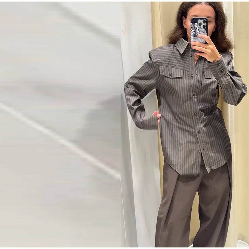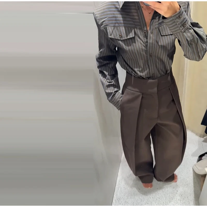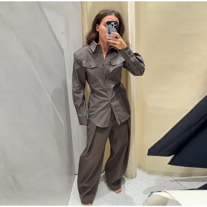 Vintage Stripe Shirt Pant Sets Women's Lapel Single-breasted Tops Front Pleated Trousers 2025 New Ladies Autumn Solid Streetwear